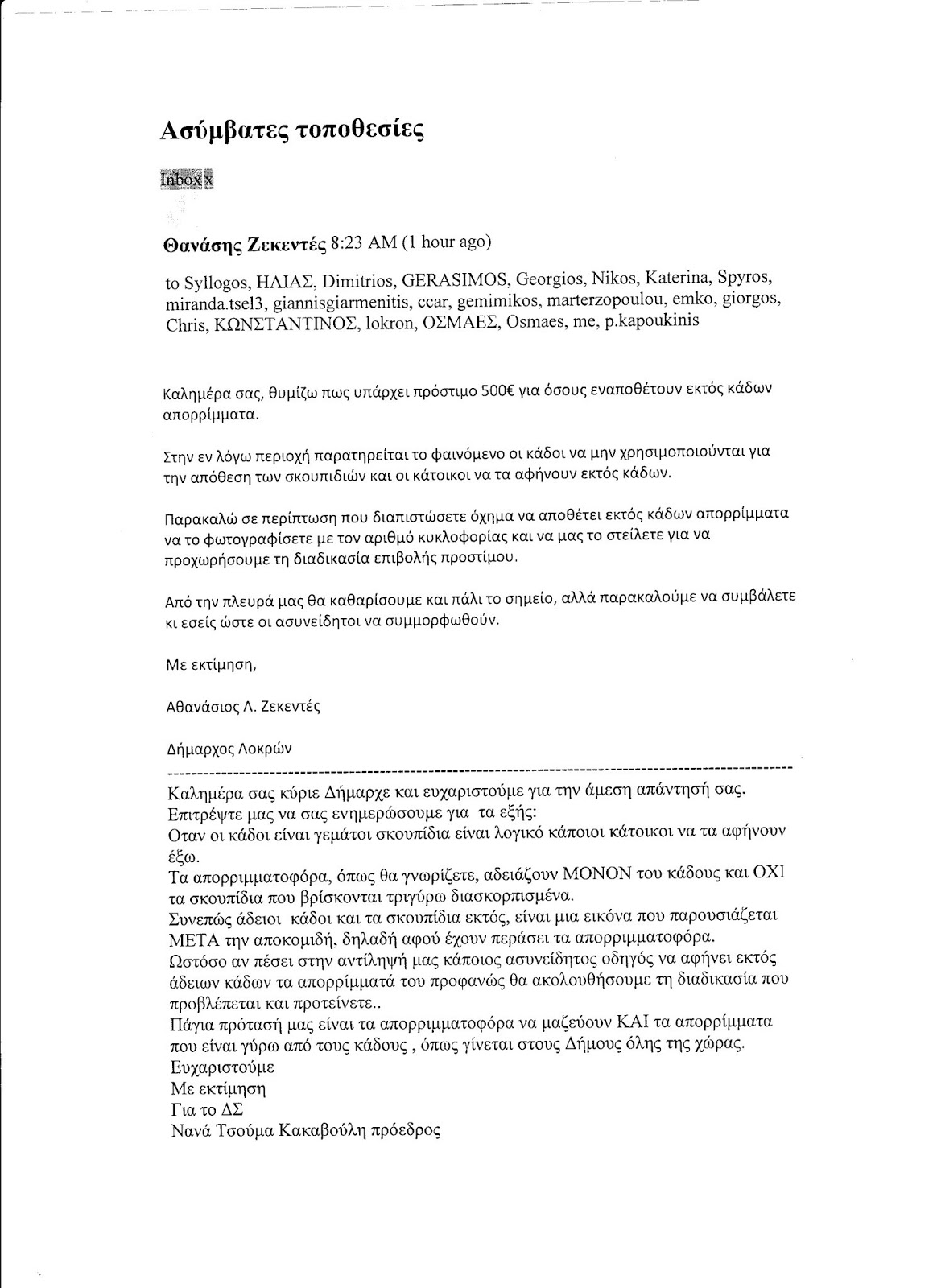 Σας κοινοποιούμε την απάντηση του κυρίου Δημάρχου Λοκρών και την απάντηση του Συλλόγου μας αναφορικά με το ζήτημα των σκουπιδιών της προηγούμενης ανάρτησης.