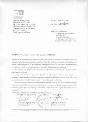 Οπως ενημερωθήκαμε με επιστολή του Προέδρου του Ινστιτούτο Μεσογειακών και Δασικών Οικοσυστημάτων κύριο Πετράκη (Αρ. Πρωτ.67017/2519/7-12-2022) η όλη διαδικασία της 1ης φάσης (επιτόπιος έλεγχος από συνεργείο και λήψη δειγμάτων ),όπως και της 2ης φάσης (εφαρμογή των αποτελεσμάτων της έρευνας επί της προσβεβλημένης περιοχής), απαιτεί κόστος 3.000 ευρώ το οποίο χρειάζεται αρκετό χρόνο για να εγκριθεί.
